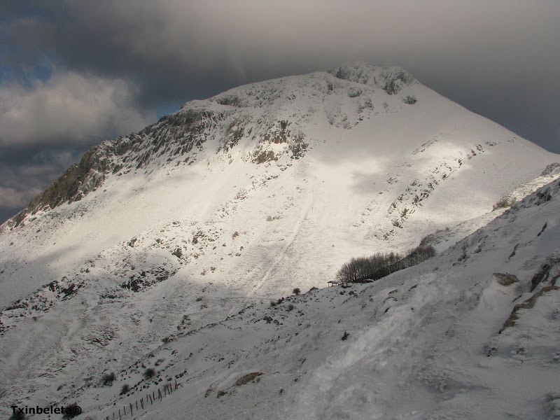 .La idea en un principio era ir al Txindoki, pero como estaba con nubes la descartamos según subíamos. La siguiente idea era tirar para el Ganbo, pero más de lo mismo. El buen tiempo se hacía de rogar, así que acabamos en esta cima del circo de Gañeta. Sitio tranquilo, todo el mundo al Txindoki como un imán, desde el desvío tan sólo nos cruzamos con tres personas, mientras que la subida 'común' con el Txindoki era un regero de gente.